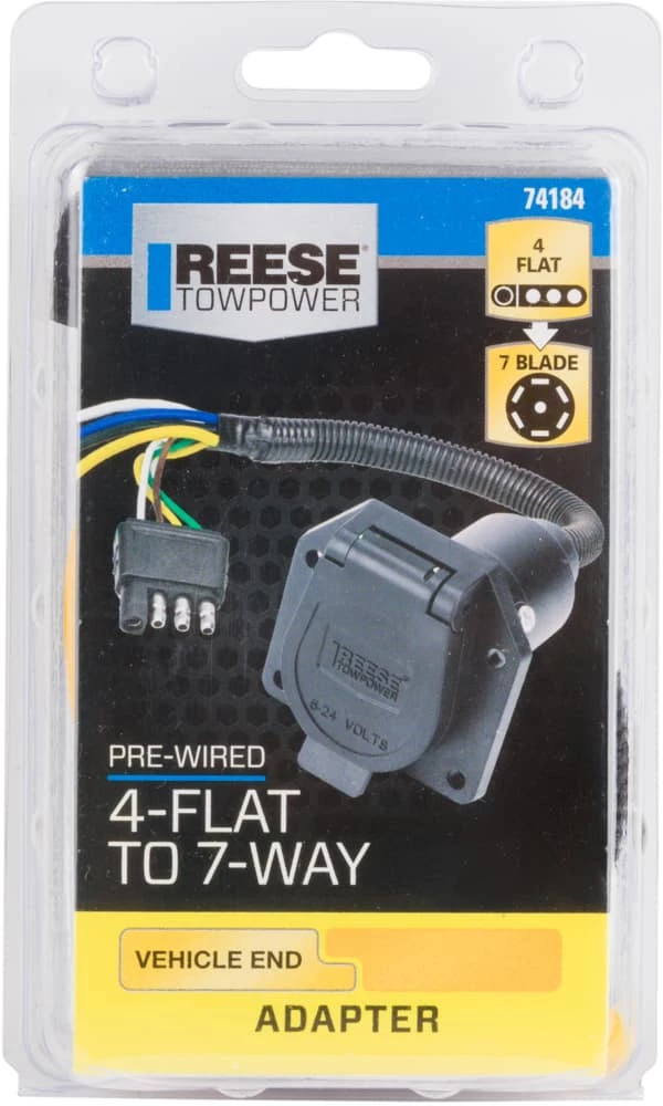 - REESE Towpower Pre-Wired Towing Electrical 7-Way Blade Connector converts any vehicle-end trailer wiring component with a 4-Way Flat connector to a 6 or 7-Way Round connector on the rear of the tow vehicle