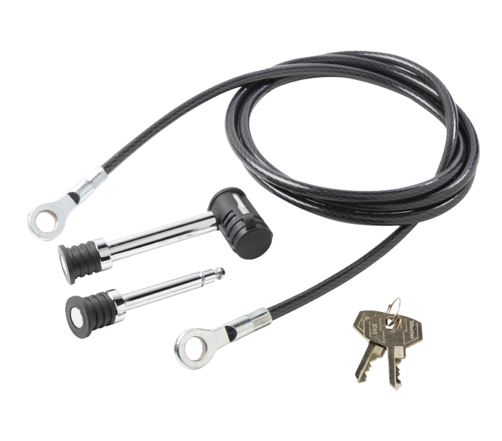 - 8-foot cable is secured to the receiver lock as it passes through your trailer hitch