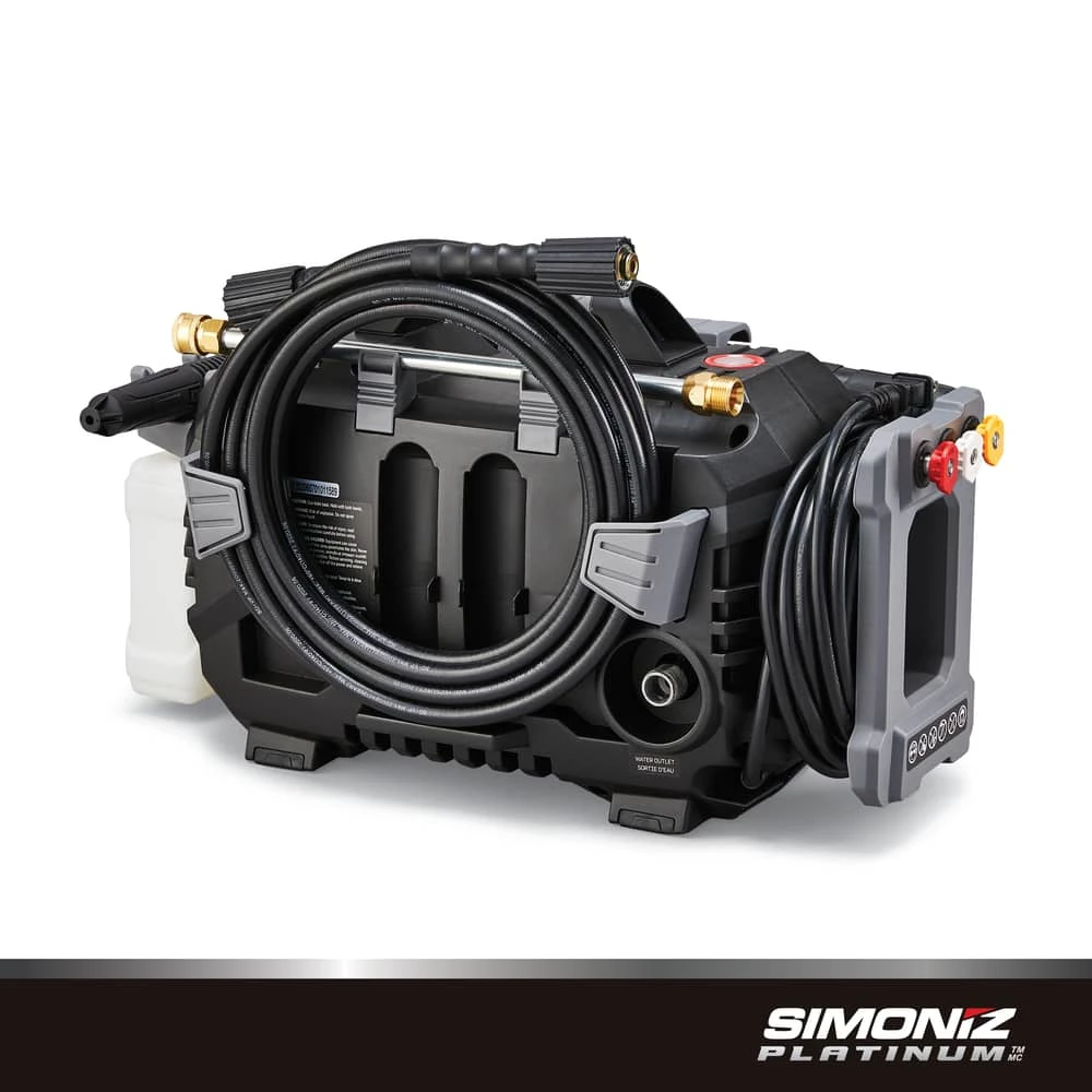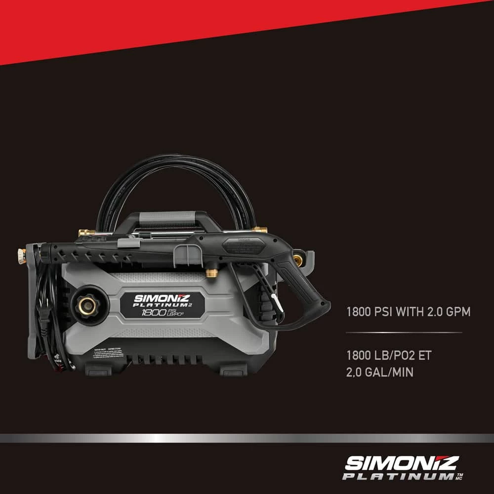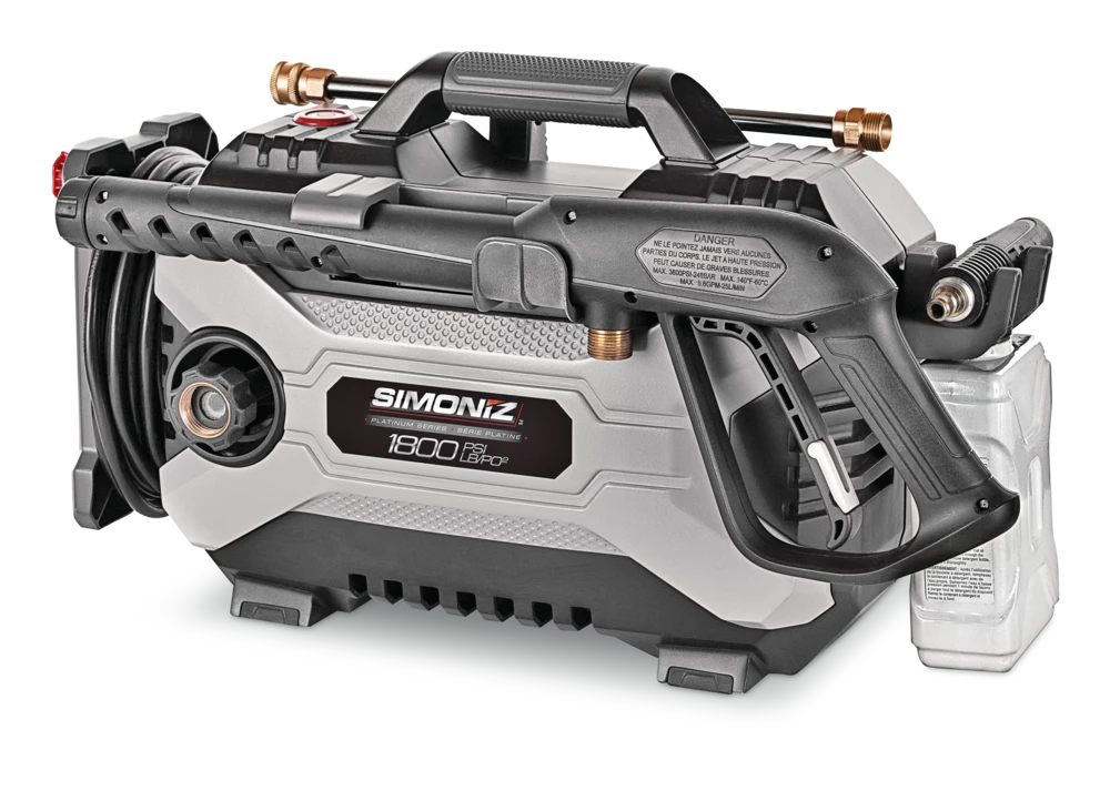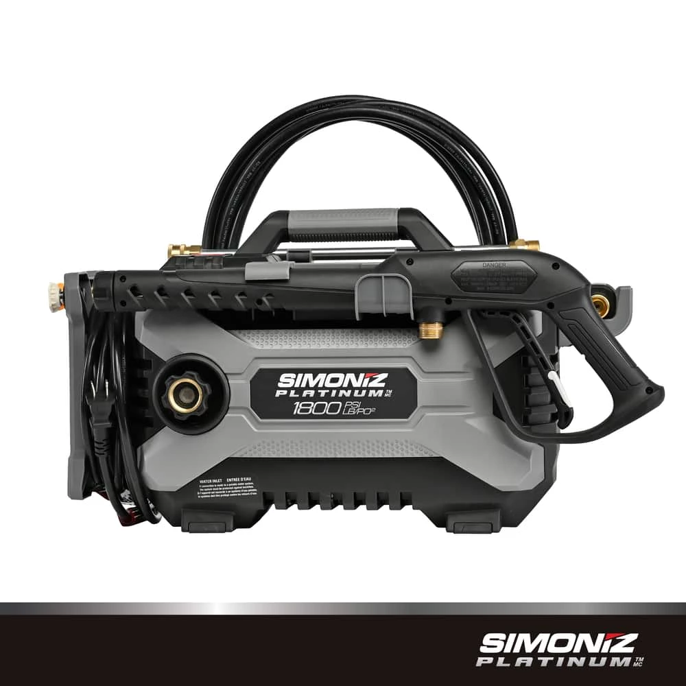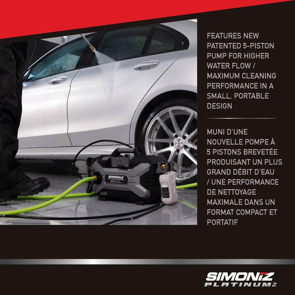 - SIMONIZ Platinum 1800 PSI Compact Electric Pressure Washer features new patented 5-Piston Pump for higher water flow / Maximum cleaning performance in a small, portable design