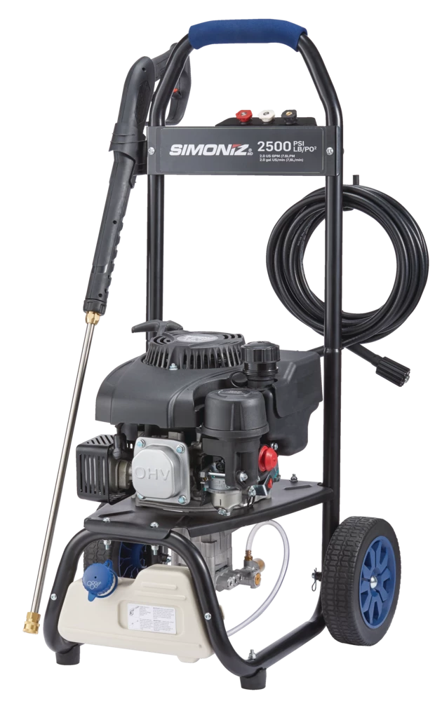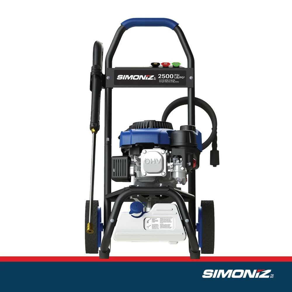 - Simoniz 2500 PSI Gas Pressure Washer with 2.0GPM is powered by a 150cc vertical engine for long lasting power and an axial aluminum pump