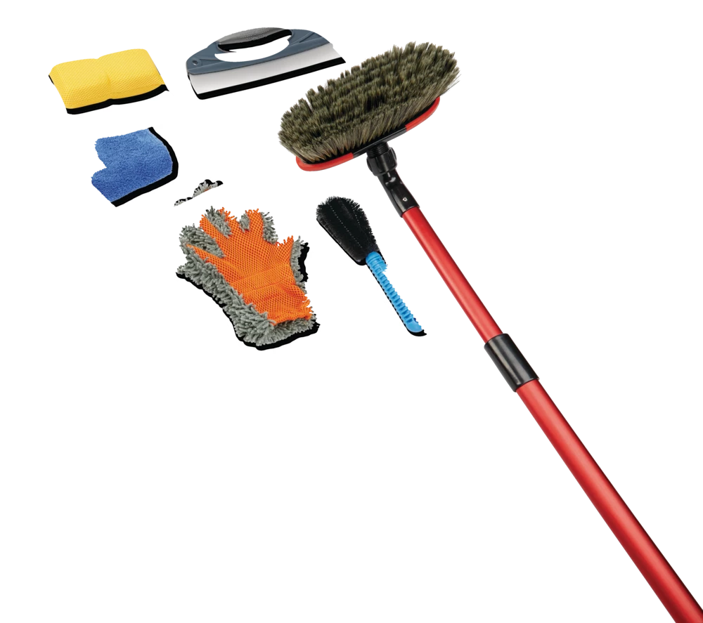 - Includes a telescoping car wash brush, wheel brush, drying blade, dusting glove, bug and tar sponge and drying towel