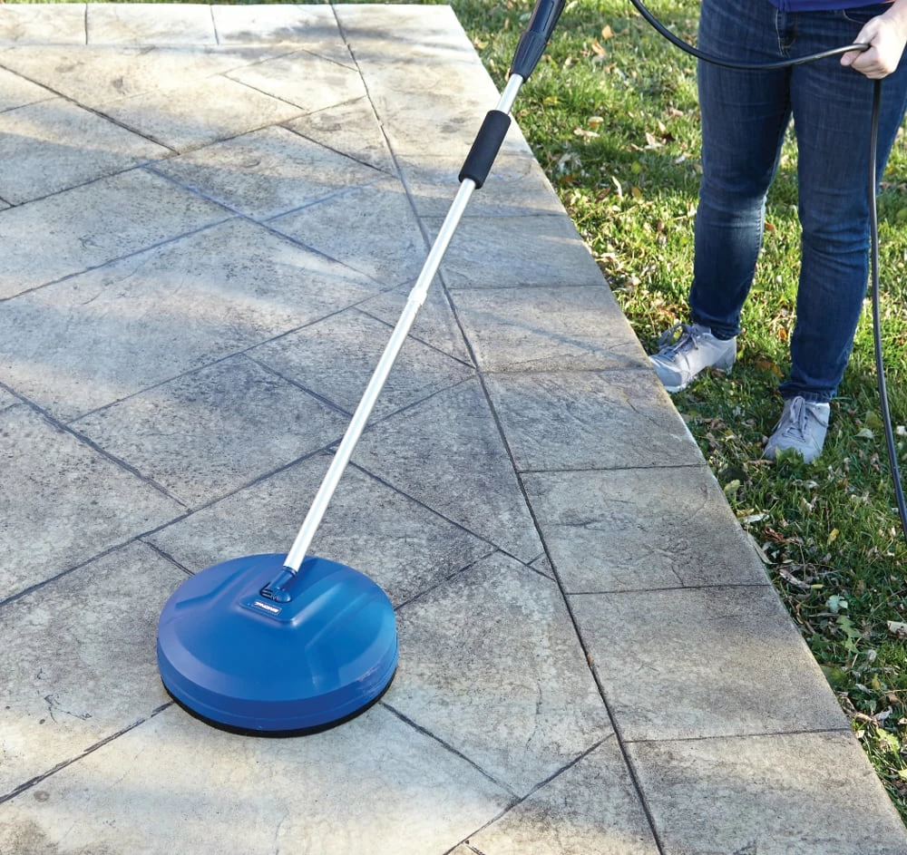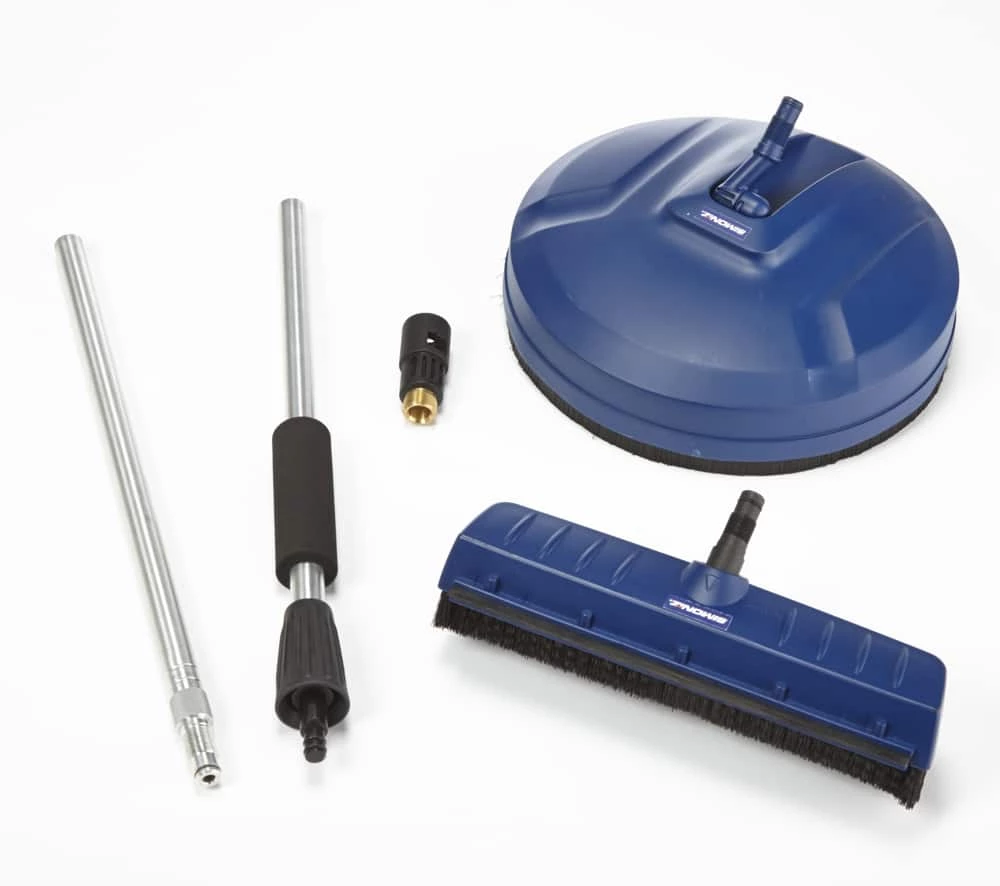 - Kit includes: 12″ (30 cm) surface cleaner, high-pressure floor brush, extension wand and universal adaptor