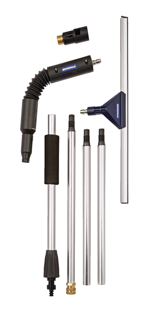 - Kit includes: 62″ (157 cm) extension wand, adjustable gutter nozzle, 18″ (46 cm) window squeegee and a universal adaptor