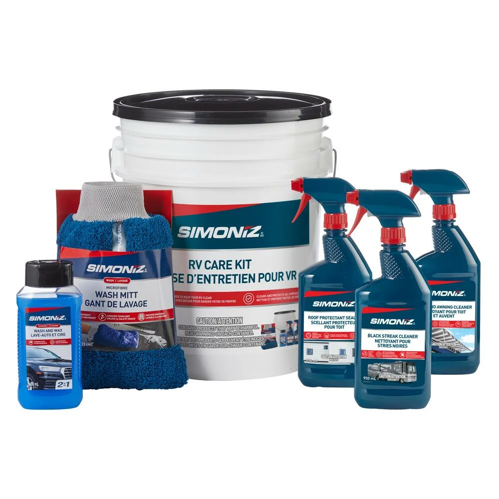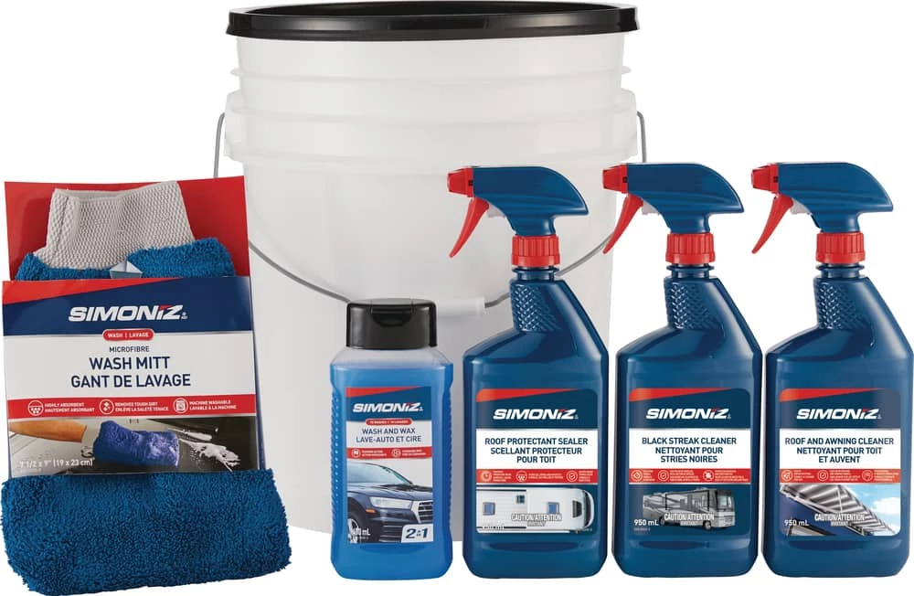 - Includes: Simoniz roof and awning cleaner, black streak Cleaner, roof protectant sealer, microfibre wash mitt, wash, wax, and Wash Bucket
